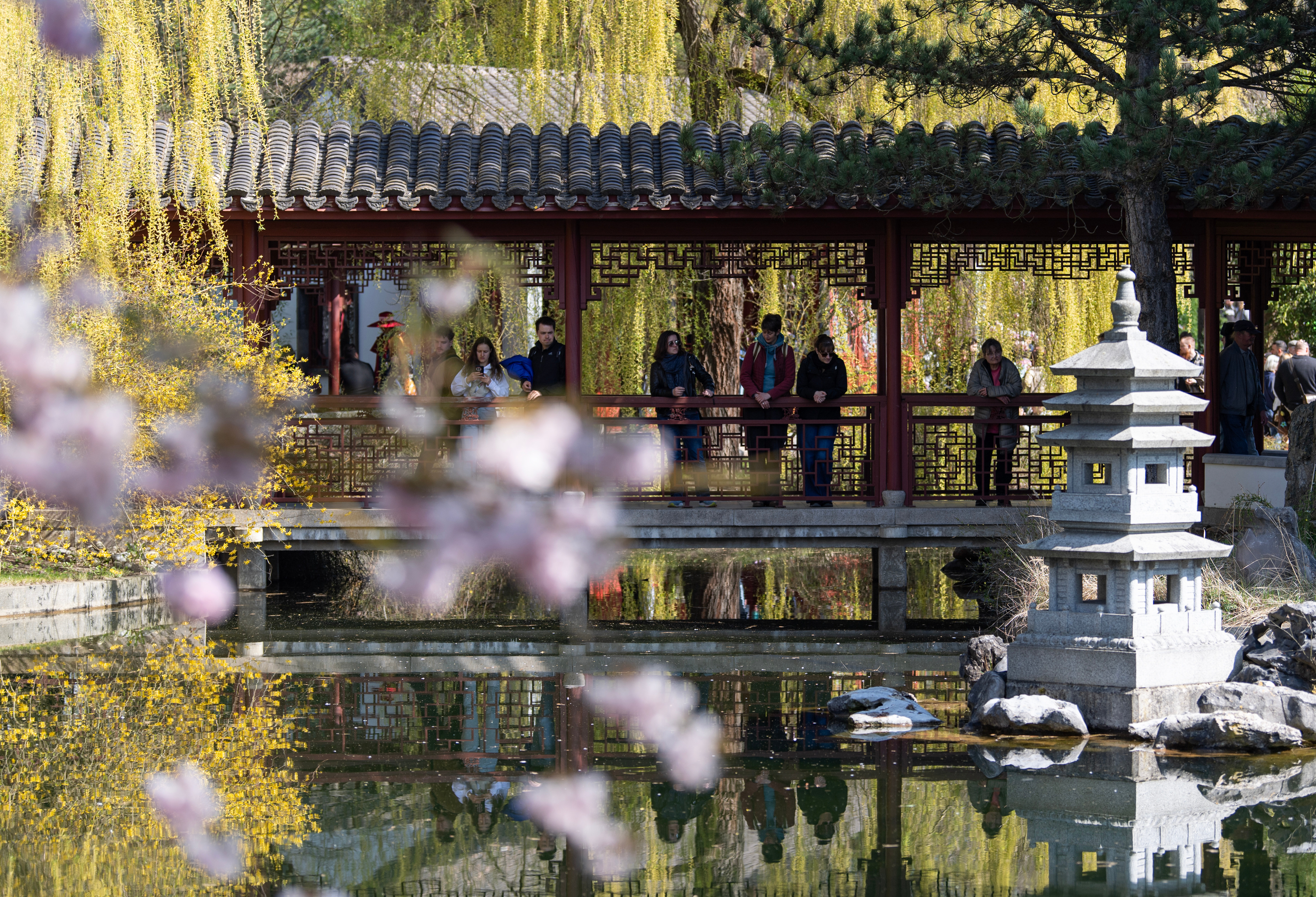 4月11日,人们在德国柏林世界公园中国园游览。