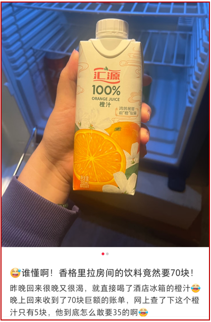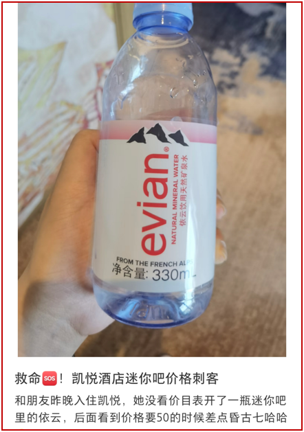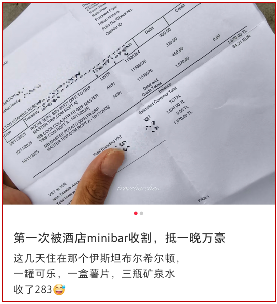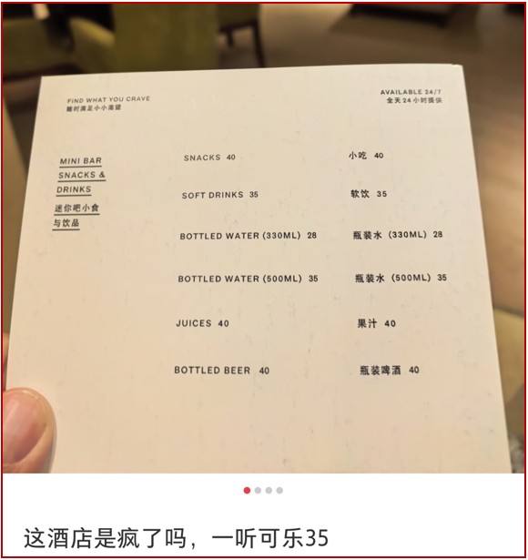 在社交平台上一搜,minibar受害者的吐槽到处都是,在账单上可以发现一颗普通花生的价格为30元、一小罐坚果价格是58元、一瓶进口矿泉水卖到68元。配文全是“看到酒店mini吧连门都不敢开”、“这辈子再也不碰房间里的小冰箱了”。